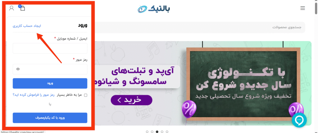 اگر تاکنون در فروشگاه اینترنتی بالتیک ثبت‌نام نکرده‌اید، کافی‌ست روی گزینه‌ی «ایجاد حساب کاربری» کلیک کنید تا مراحل ساخت حساب جدید برایتان آغاز شود.