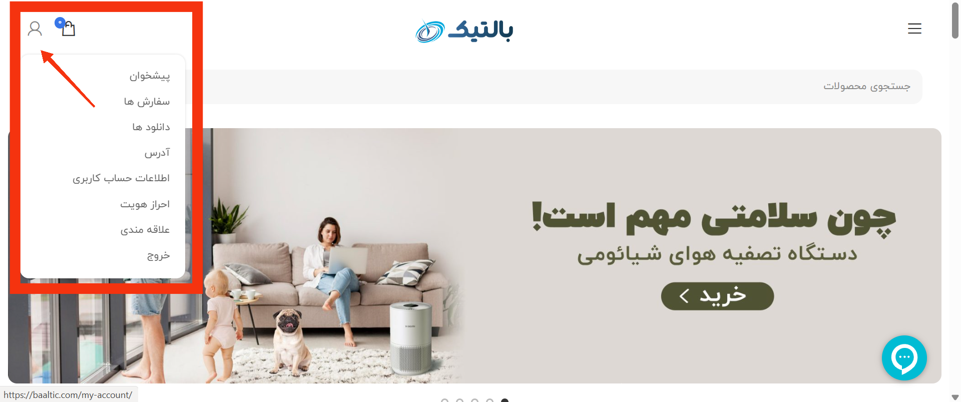 برای آغاز فرایند ثبت سفارش، ابتدا وارد وب‌سایت بالتیک شوید. در بخش بالایی صفحه، بر روی آیکون آدمک (نماد “حساب کاربری من”) کلیک کنید. اگر پیش‌تر در سایت ثبت‌نام کرده‌اید، تنها کافی‌ست گزینه‌ی «ورود» را انتخاب کرده و با وارد کردن شماره موبایل و رمز عبور خود، به پنل شخصی‌تان دسترسی پیدا کنید.