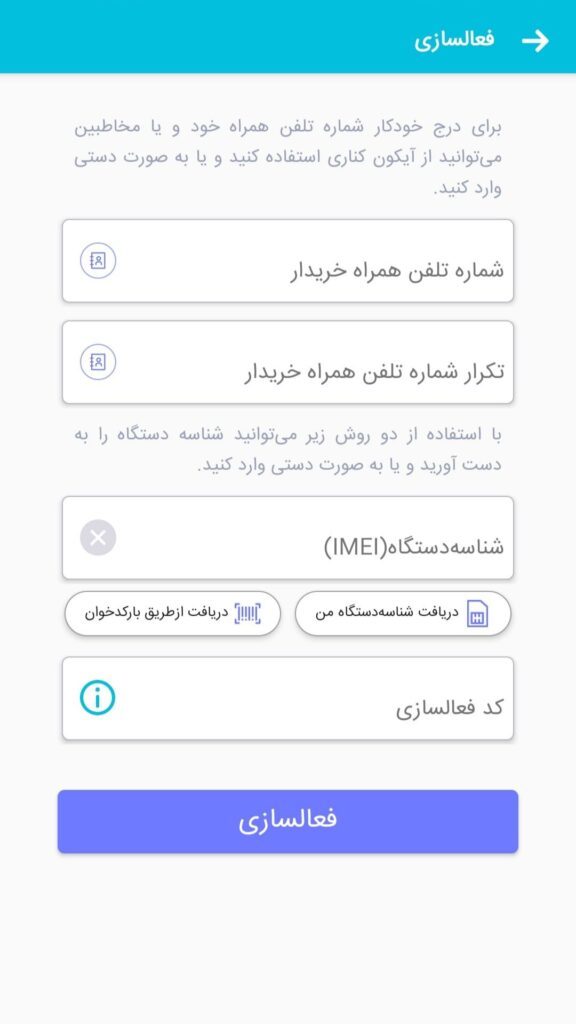 • وارد کردن اطلاعات دستگاه: در این مرحله لازم است اطلاعاتی مانند شناسه IMEI دستگاه، شماره سیم‌کارت مورد نظر و کد فعال‌سازی را به دقت وارد کنید. اطلاعات دقیق را از جعبه گوشی یا کارت گارانتی دریافت کرده و بدون اشتباه ثبت کنید.