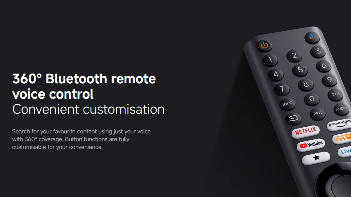 ریموت کنترل بلوتوثی تلویزیون 4K QLED شیائومی مدل 43 A Pro 2026، قابلیت پوشش 360 درجه دارد. این ریموت، امکان کنترل آسان و بدون نیاز به جهتدهی مستقیم به تلویزیون را فراهم میکند. ریموت کنترل این تلویزیون به دکمه مخصوص فعالسازی دستیار صوتی Google Assistant مجهز است که با فشردن آن میتوانید به سادگی از طریق فرمان صوتی، تلویزیون را کنترل کرده و به جستجو یا اجرای برنامهها بپردازید.